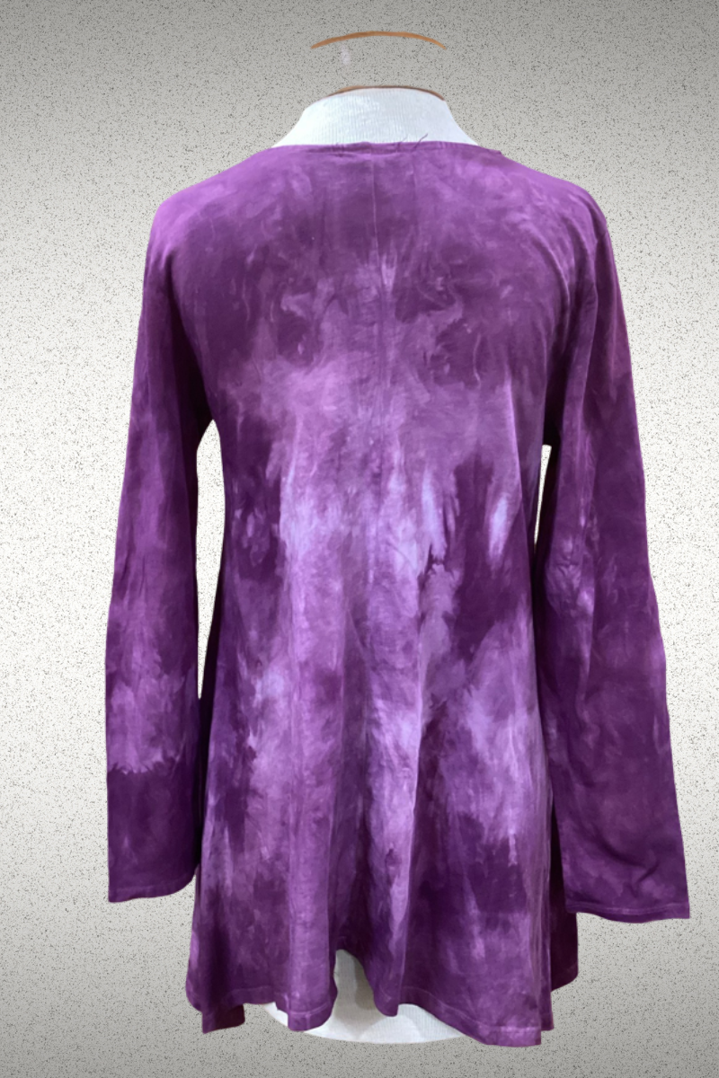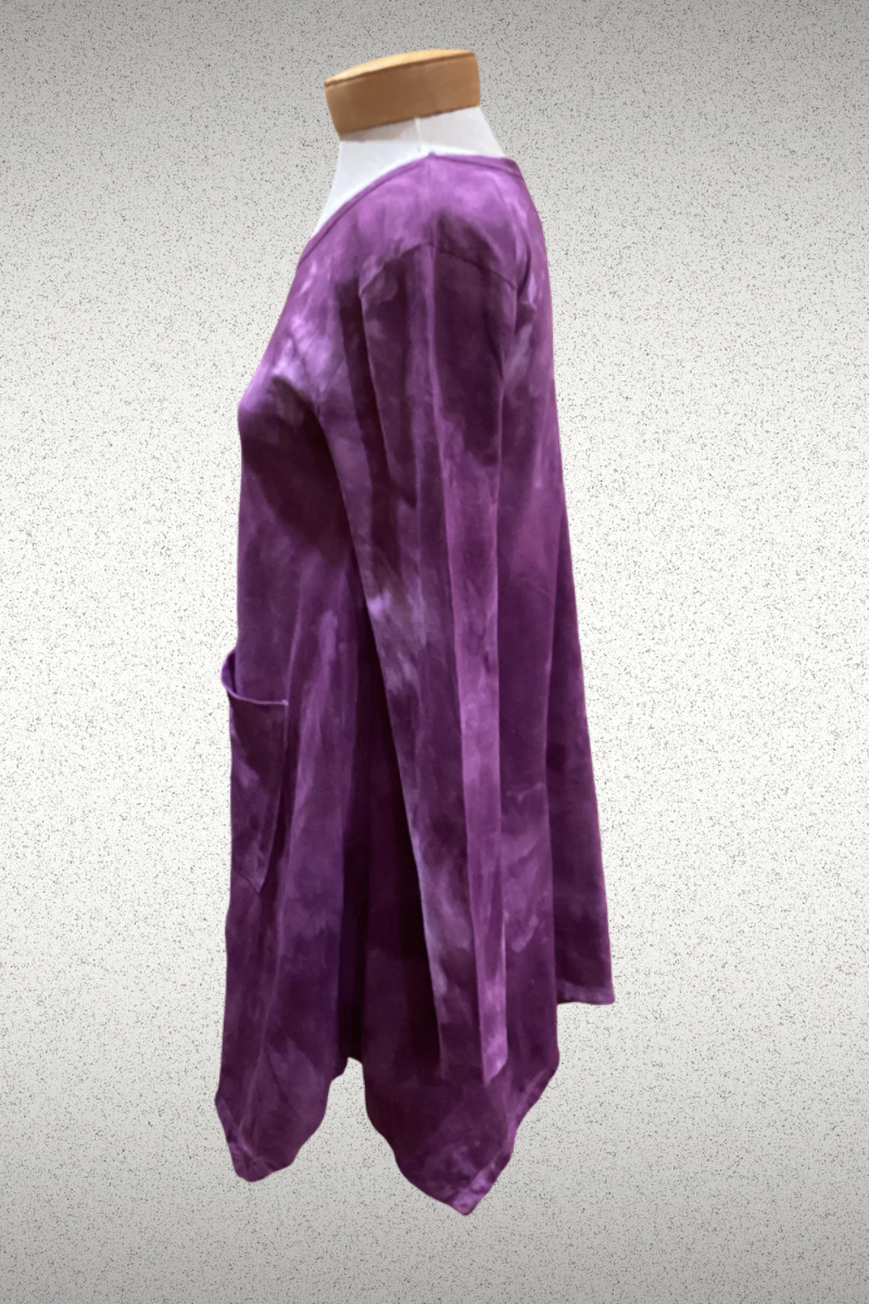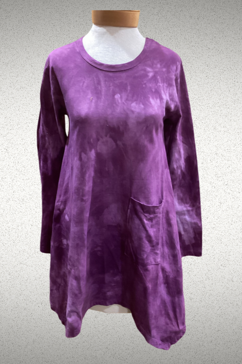 Elevate your everyday wardrobe with this one-of-a-kind, hand-dyed tunic. The rich violet hues create a dreamy watercolor effect, ensuring no two pieces are exactly alike. Designed with both comfort and style in mind, this tunic features a relaxed fit, long sleeves, and a subtle scoop neckline. A single front pocket adds a touch of practicality while keeping the look effortless.