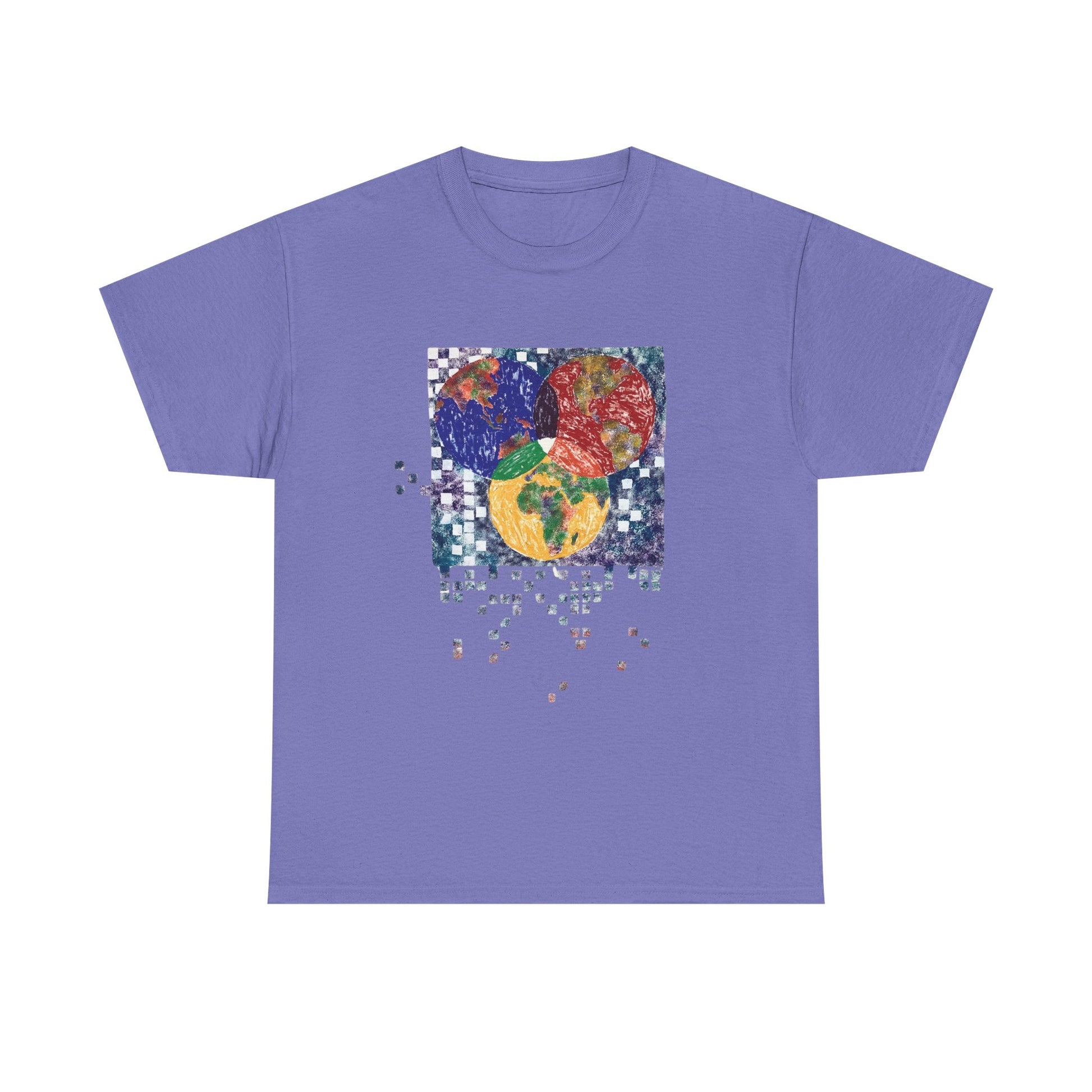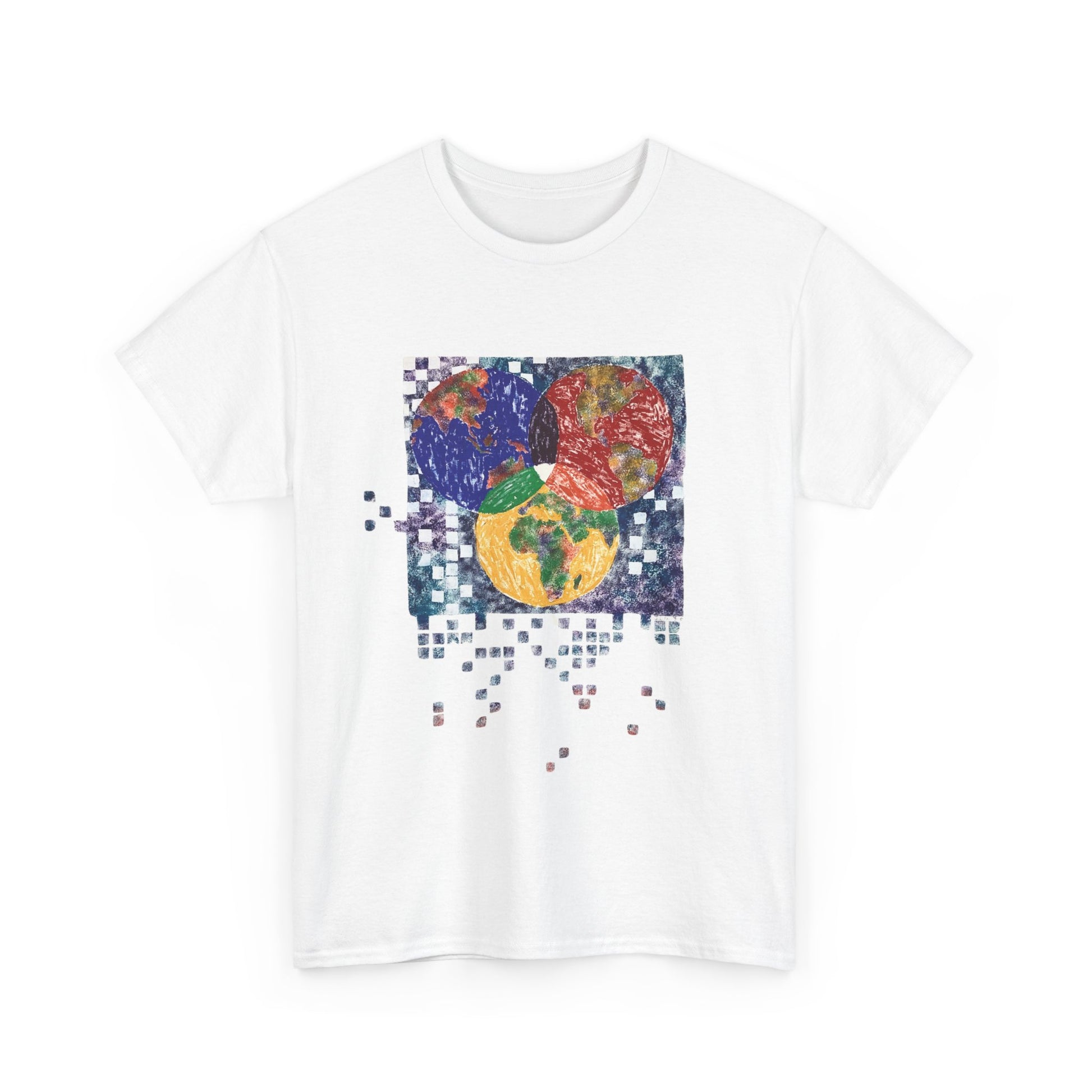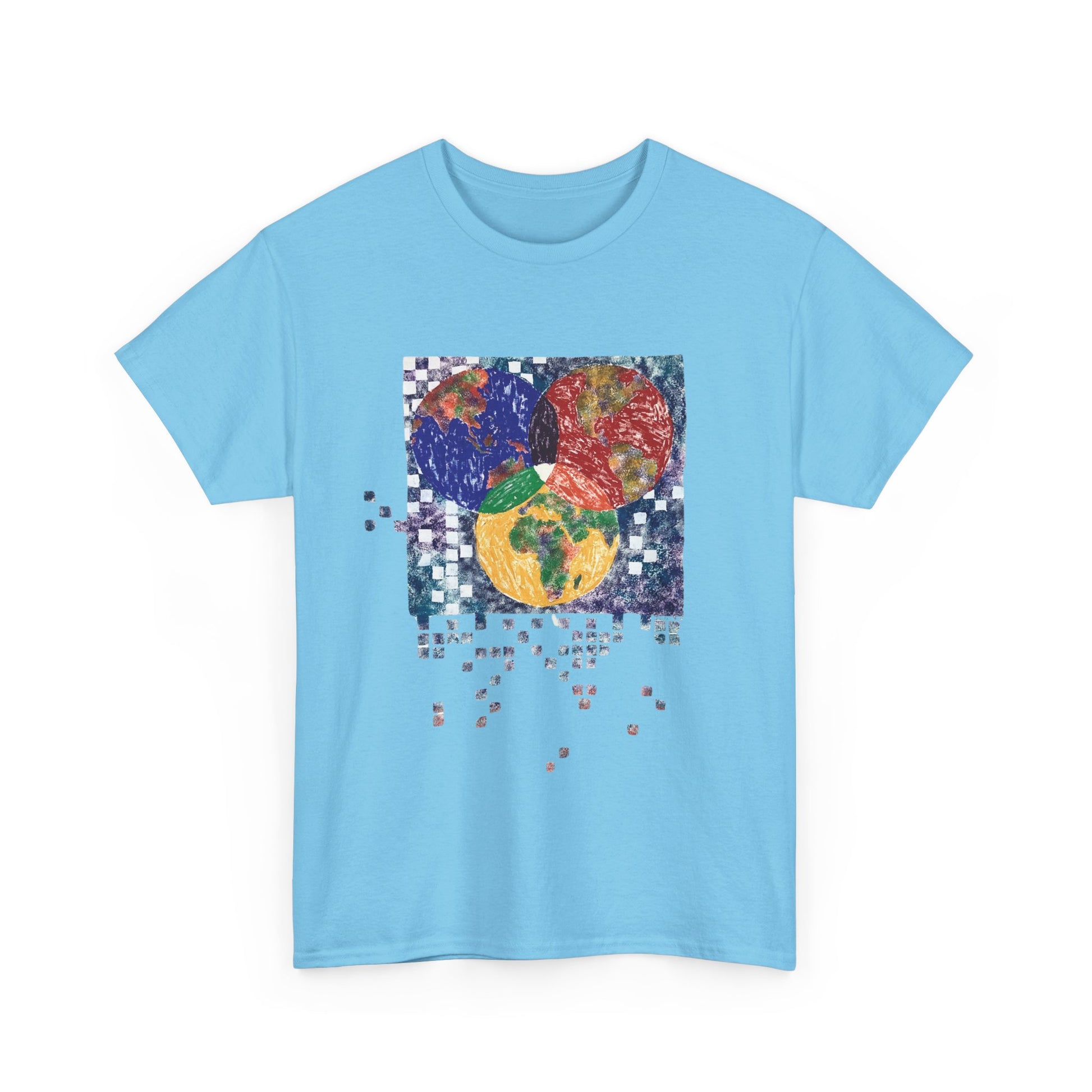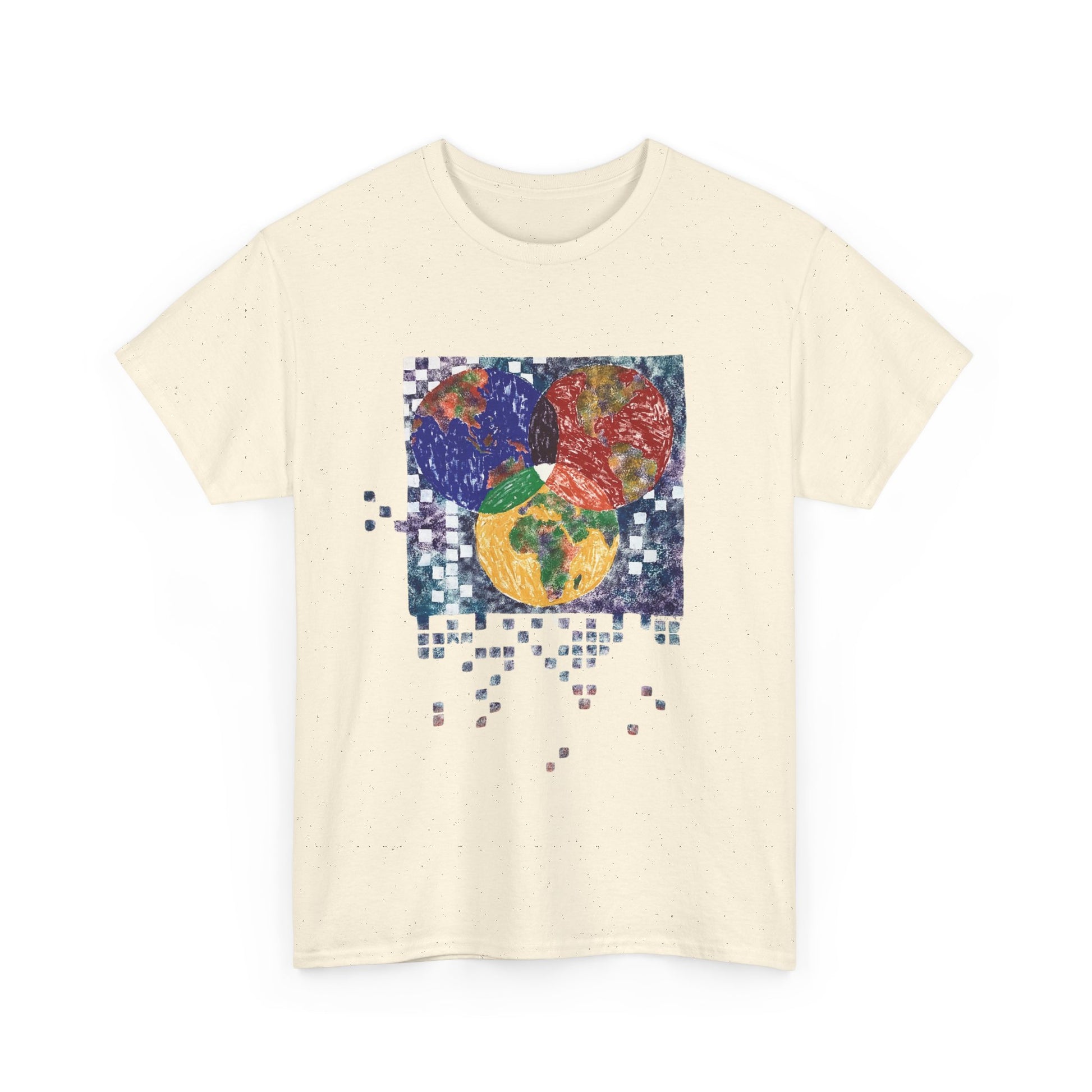 Crafted from premium heavy cotton, this unisex tee offers a soft yet durable fit with a ribbed knit collar and reinforced shoulder tape for long-lasting wear. Whether you're an advocate for global unity, a lover of abstract expression, or simply drawn to unique, conversation-starting fashion, this shirt is made for you.