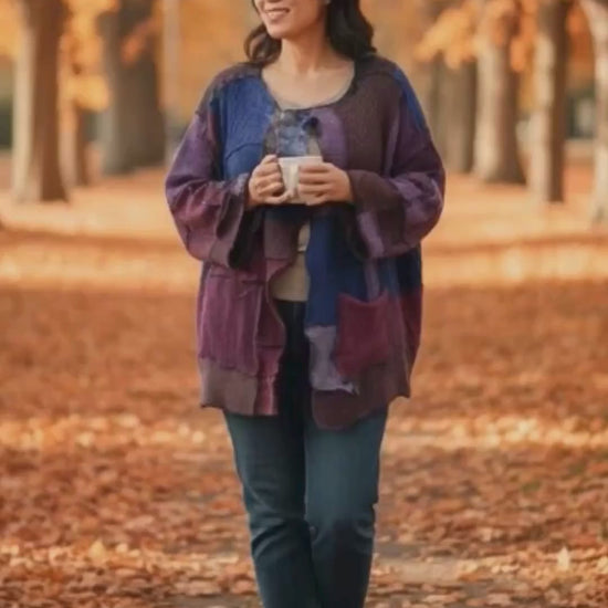 One-of-a-Kind Patchwork Sweater Jacket — Plum & Indigo Dream (Handmade, Artisanal, Boho Knitwear)