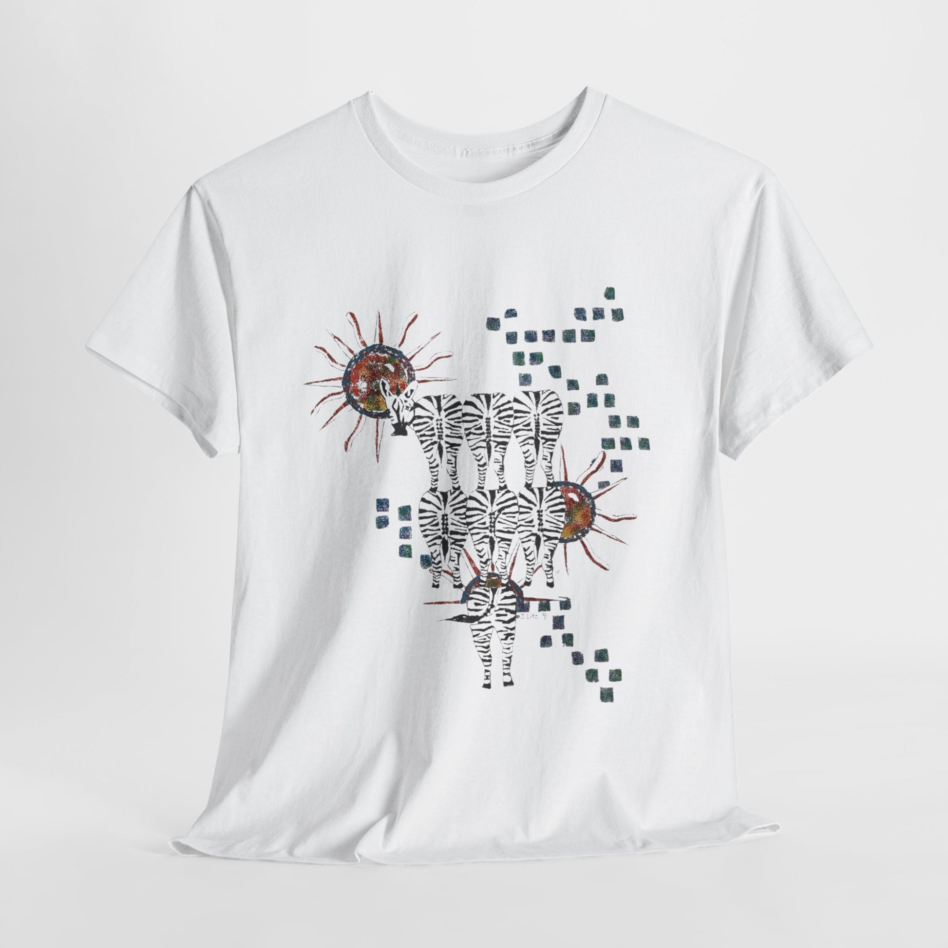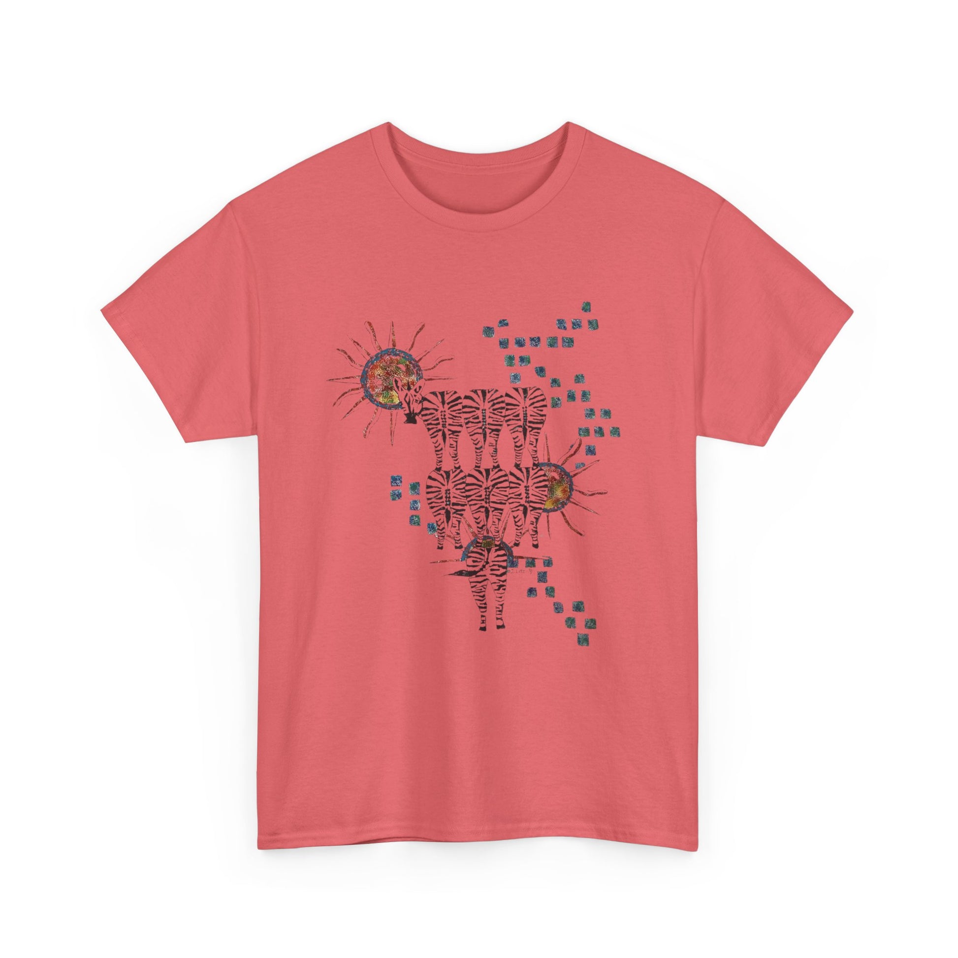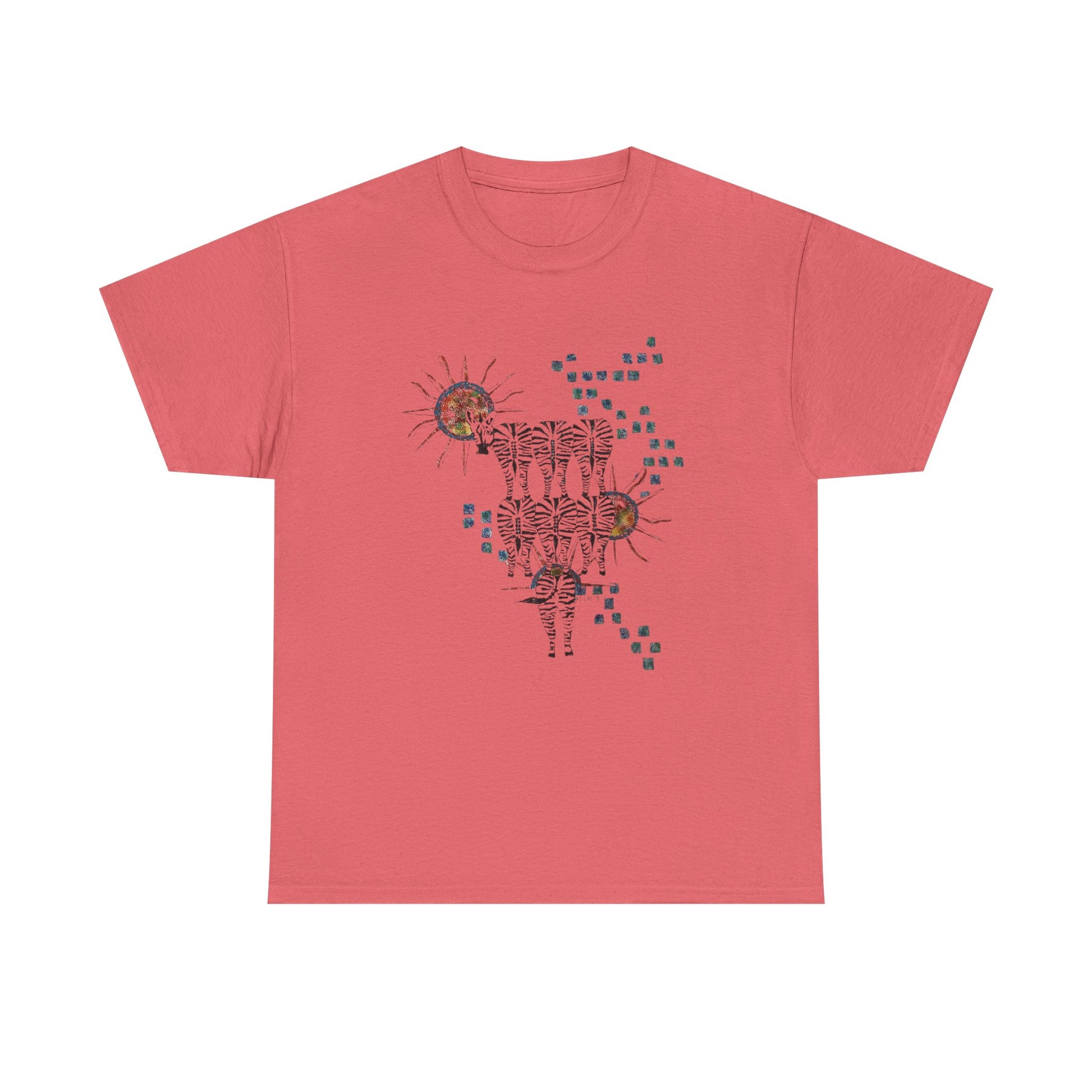 The Solar Stripes Unisex Cotton Tee is a bold artistic expression of balance, movement, and transformation. This mesmerizing design features a herd of zebras, their striped forms blending into a surreal landscape of radiating suns and pixelated energy, symbolizing the harmony between chaos and order. The contrast between the dark, intricately detailed zebras and the luminous celestial bodies creates a dynamic, otherworldly effect—perfect for those who embrace their wild, untamed spirit.